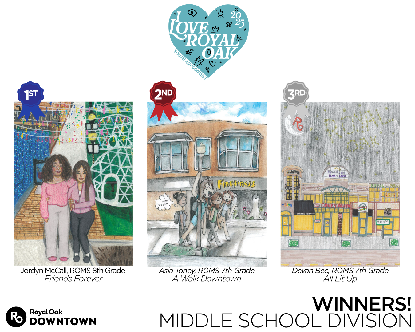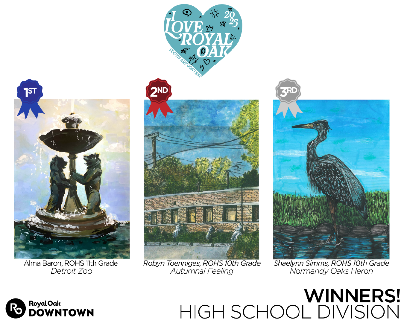 Winners from each contest division will be awarded monetary prizes. All participating students will receive a certificate, a special Royal Oak sticker, and have their art displayed around Downtown Royal Oak businesses during the month of March.