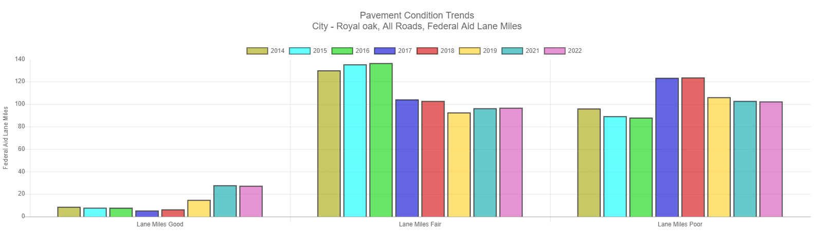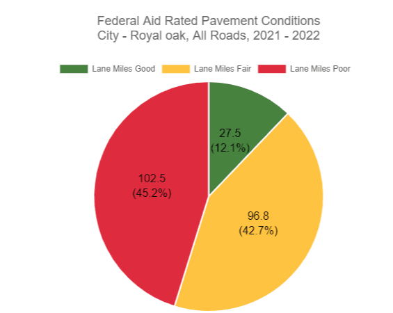Royal Oak's most recent pavement surface conditions can be found in this report, last updated in 2023. TAMC also provides a summary of the PASER data in graphical form on its website. The latest PASER data from TAMC is shown below.