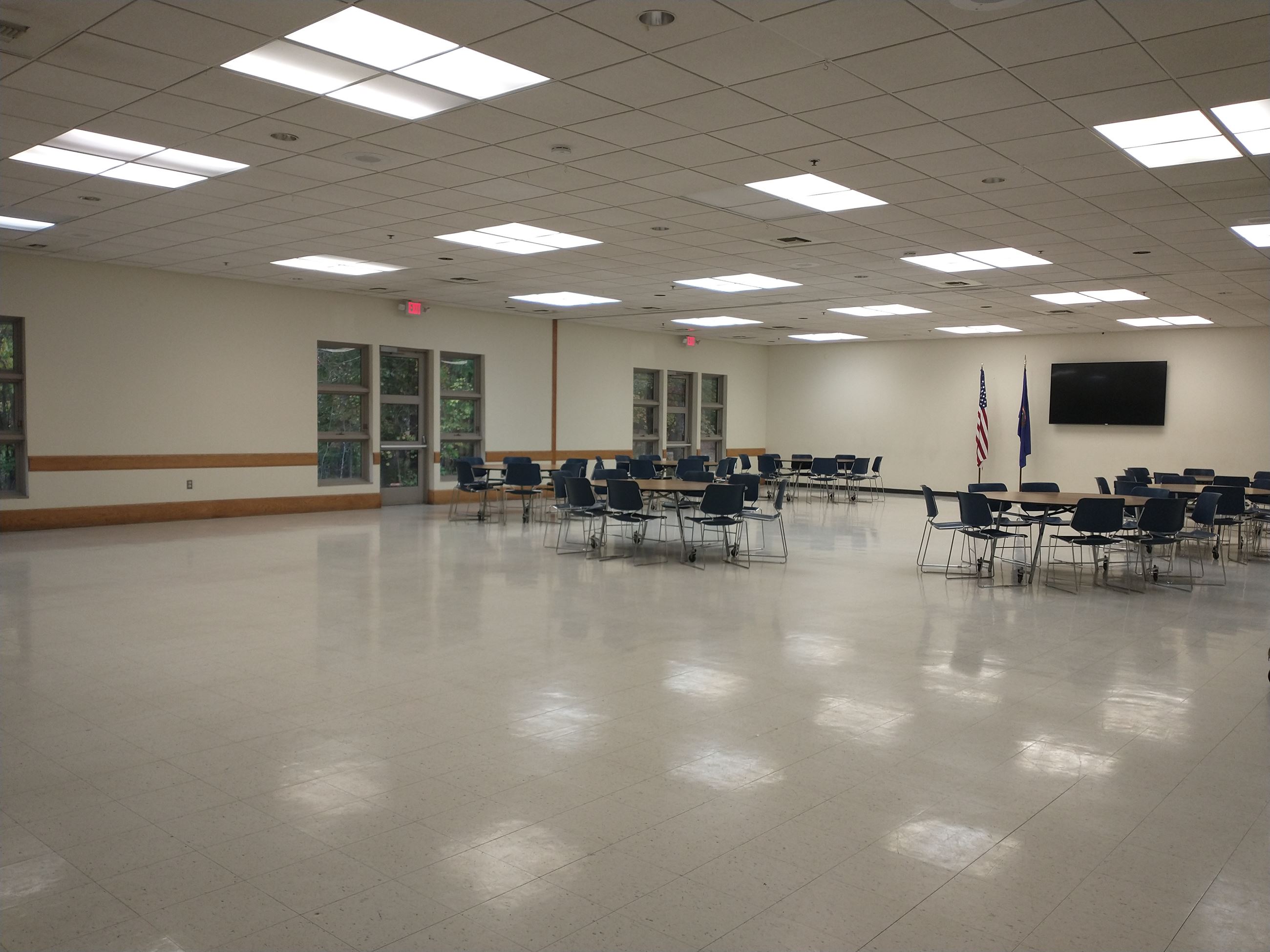 $55$68.7545Rectangular tables, chairs, tiled floor, 75-inch monitor, two sinks