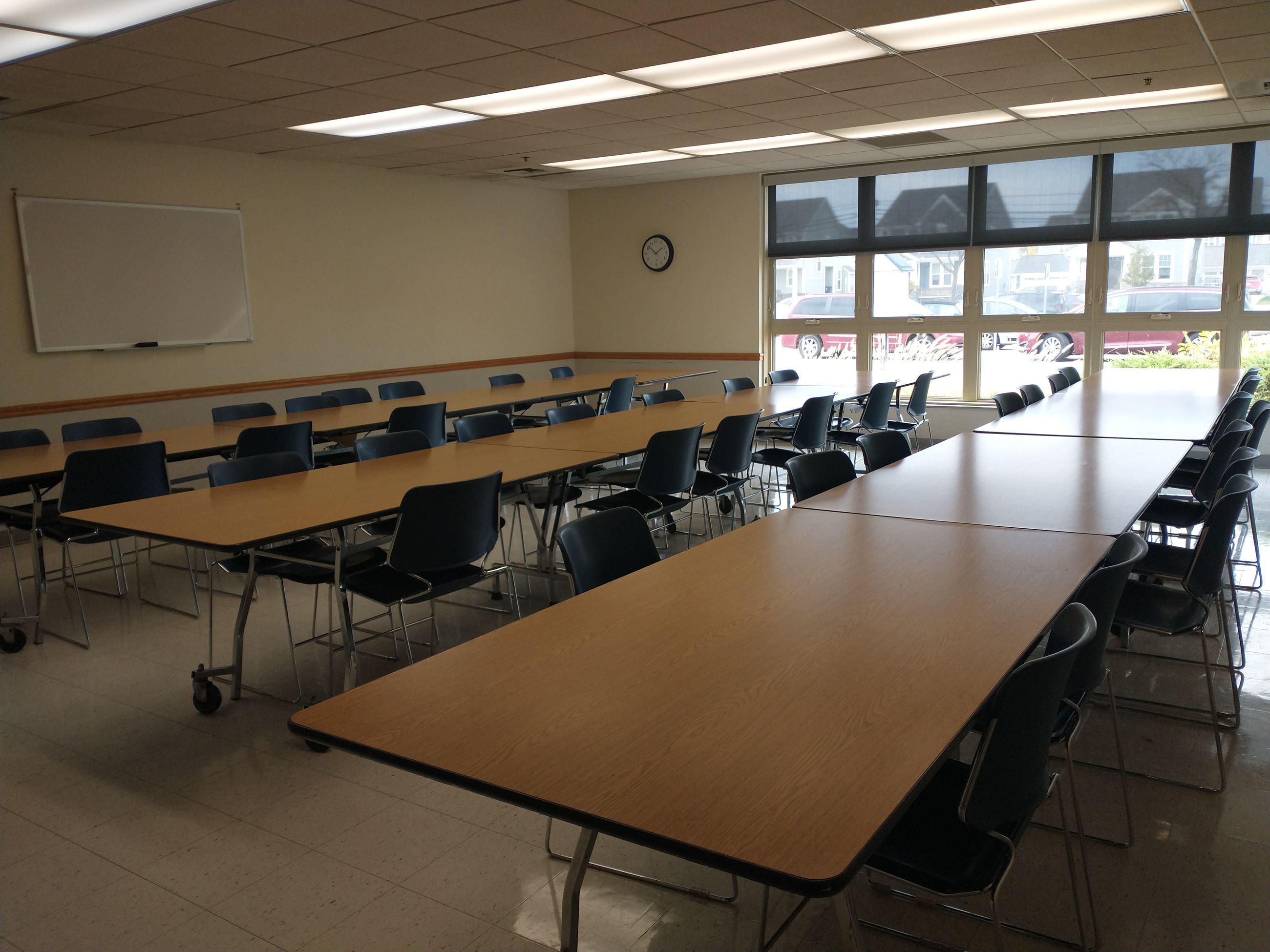 $30$43.7520Rectangular and square tables, chairs, carpeted floor; dry-erase board, TV in the corner