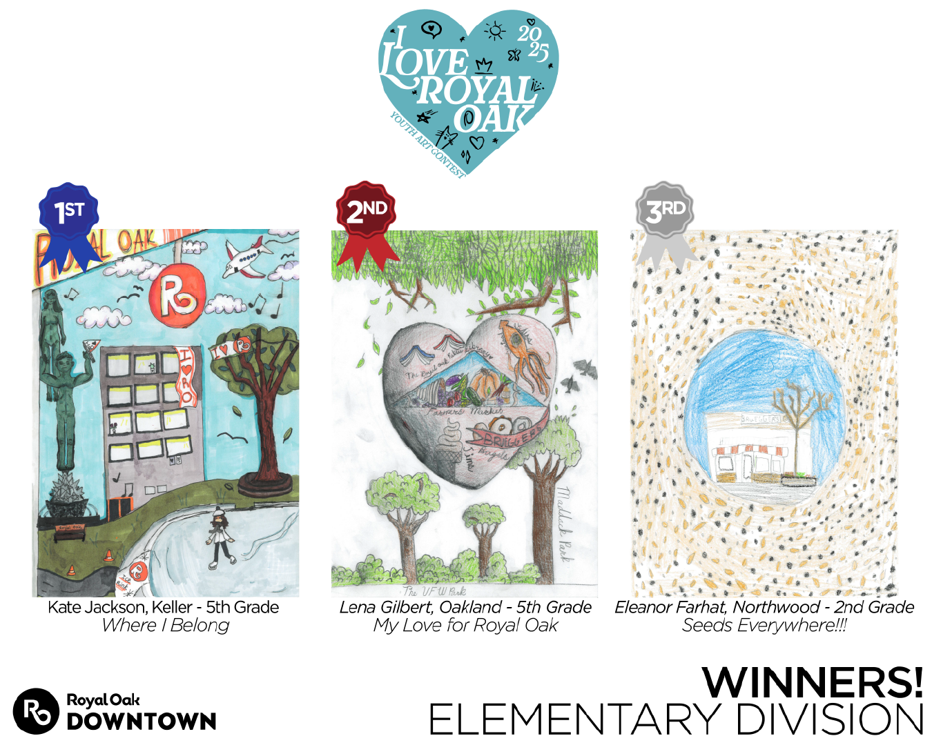 Winners from each contest division will be awarded monetary prizes. All participating students will receive a certificate, a special Royal Oak sticker, and have their art displayed around Downtown Royal Oak businesses during the month of March.